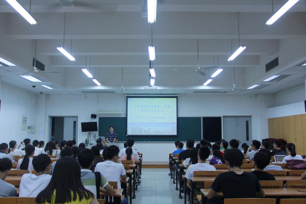 本网讯5月17日晚,我院院长易行健教授在南校区教学楼G座105开展金融精英论坛第七讲,畅谈“中国宏观经济现状、发展阶段与未来走向”。该讲座也是“金融学院学生素质提升计划暨金融学院院风学风建设”系列活动之“金融学院杰出学者讲坛第一讲”,旨在邀请校内云山学者就他们研究领域或者最新研究成果为同学们开展讲座,丰富同学们的知识。讲座由我院党委副书记赵观音主持。