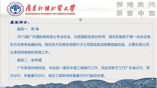 2021年3月18日晚,2015届校友周锋、88级校友金伟煌应邀做客“广外金融精英论坛暨广外财富论坛”第23讲,以“银行业和证券业发展情况”为主题,给我院师生带来一场别开生面的分享会。本次讲座采用线上方式进行,由学院党委副书记赵观音主持,各年级本科、硕士生和部分专业老师参与交流。