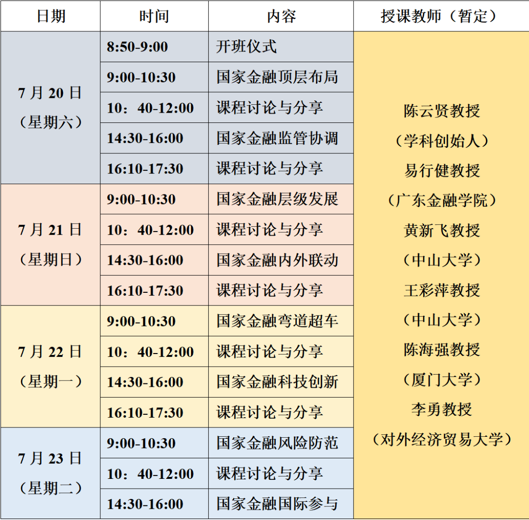《国家金融学》是一门从国家视角研究金融问题的新型金融学科,它有别于一般金融学所涉及的国家金融事务方面的问题,而是从现代金融体系发展的六大要素(现代金融市场体系、现代金融组织体系、现代金融法治体系、现代金融监管体系、现代金融环境体系和现代金融基础设施体系)入手,涉及破解一国金融发展核心而又紧迫的金融顶层布局的现实问题。《国家金融学》这一课程已作为北京大学、中山大学、复旦大学、厦门大学、浙江大学、暨南大学、西南财经大学、广东外语外贸大学、广东金融学院国内众多高校的研究生选修课,开设时间多年,课程内容深受学生好评。为进一步扩大“国家金融学”学科的影响力,加强各高校教师学术交流,提升科研及教学水平,中山大学国际金融学院、中山大学国家金融学研究院和广东外语外贸大学金融学院拟于2024年7月20日至23日联合举办“第四届国家金融学师资培训”,欢迎国内各高校经济金融类学科教师参与。