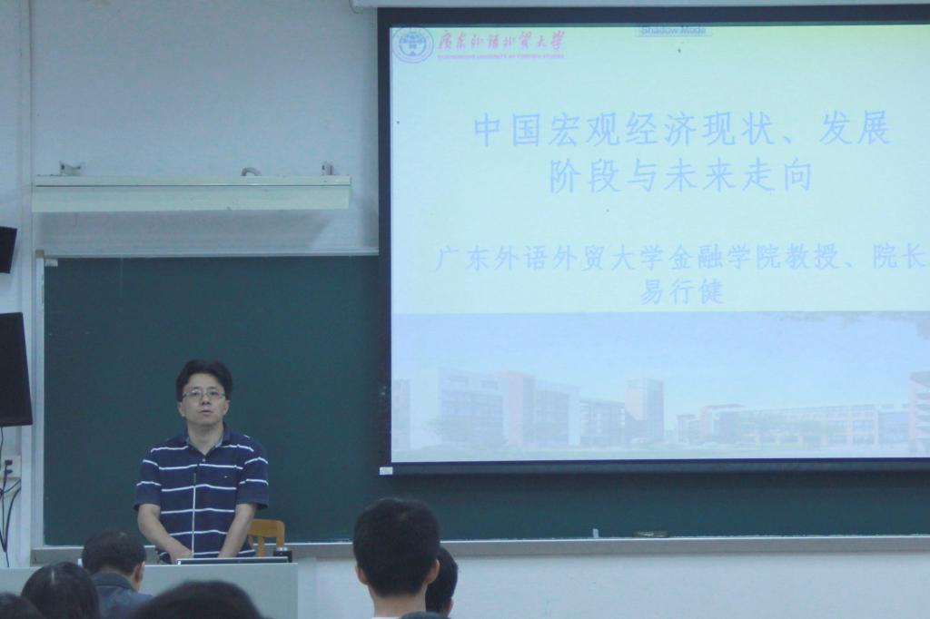 本网讯5月17日晚,我院院长易行健教授在南校区教学楼G座105开展金融精英论坛第七讲,畅谈“中国宏观经济现状、发展阶段与未来走向”。该讲座也是“金融学院学生素质提升计划暨金融学院院风学风建设”系列活动之“金融学院杰出学者讲坛第一讲”,旨在邀请校内云山学者就他们研究领域或者最新研究成果为同学们开展讲座,丰富同学们的知识。讲座由我院党委副书记赵观音主持。