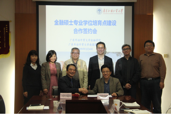3月4日下午,广东外语外贸大学南国商学院副校长何艾兵、发规处处长张艳凤、副院长胡萍来访我院,与我院签订了金融硕士专业学位培育点建设合作协议。我院院长易行健,副院长展凯、张浩、杨菁菁出席签约仪式。
