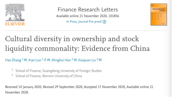 近日,我院2019级金融专业硕士罗贤同学为第二作者(导师为第一作者)的文章Cultural diversity in ownership and stock liquidity commonality: Evidence from China被经济金融类SSCI一区杂志Finance Research Letters正式接受并在线发表。其成为我校应用经济学学科首位在经济金融类SSCI一区杂志发表论文的在读硕士研究生,这也标志着我院研究生教育水平及培养质量迈上新台阶。