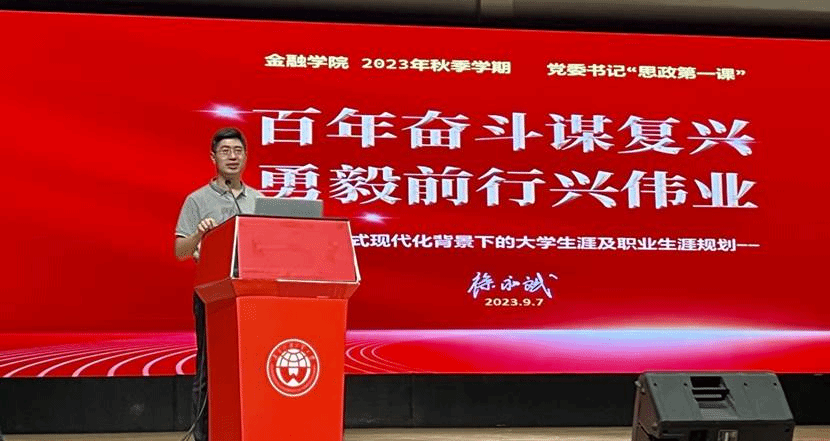 典礼结束后,徐昶斌以“百年奋斗谋复兴,勇毅前行兴伟业——中国式现代化背景下大学生涯及职业生涯规划”为题讲授新学期“思政第一课”。他首先带领同学们认真学习领会党的二十大精神及总书记关于教育强国和青年工作的重要论述精神,详细讲解“中国式现代化”提出的背景意义、历史过程以及重要特征、本质要求。他指出,概括提出并深入阐述中国式现代化理论是党的二十大的一个重大理论创新,是科学社会主义的最新重大成果。随后,他结合党的二十大报告原文,从行业、地域、单位三个角度介绍了大学生未来就业择业选择可以重点思考和关注的方面并提出意见建议。他还针对“中国式现代化的美好期待与当下内卷严重的就业形势,我们将何去何从”的问题,向同学们提出树立生涯规划意识、提高生涯规划能力的要求,并结合大学不同阶段的生涯发展任务建议同学们采取有针对性的发展策略、完成各自的生涯规划任务。最后,他结合习近平总书记对广大青少年的寄语,勉励同学们努力成为以中国式现代化全面推进中华民族伟大复兴赛道上的青春支柱、青春栋梁。